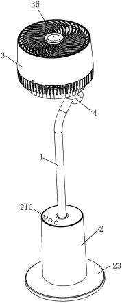 风扇是一种利用电动机驱动扇叶旋转,达到使空气加速流动的家用电器,主要用于清凉消暑和流通空气等。目前,市场上的台式风扇或落地风扇结构相对单一,大多只能在水平方向调节扇体的位置,无法在竖直方向调节扇体的俯仰位置,导致限制了风扇的送风区域。少部分风扇即便可以调节扇体的俯仰位置,也仅仅能够在较小的弧度范围内进行调节,不利于扩展送风区域。因而需要设计一款既能在水平方向调节扇体的位置,又能在竖直方向调节扇体的俯仰位置的风扇结构。